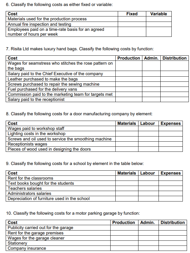 In some tasks in your assessment you may be have to use more than one classification at a time. For example, Factory rent is a production cost that is fixed and indirect. Direct materials are a production cost that is also variable. Direct labour is not necessarily a variable cost. For a car repair service, for example, it is possible to identify how much time a particular repair takes (by using job cards to record time) but the mechanic may be on a fixed salary per month. Sales commission is a variable selling and distribution cost.