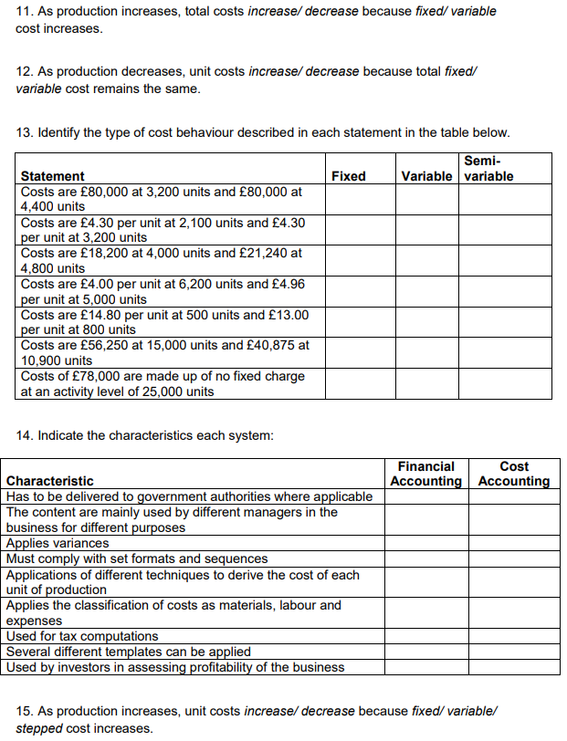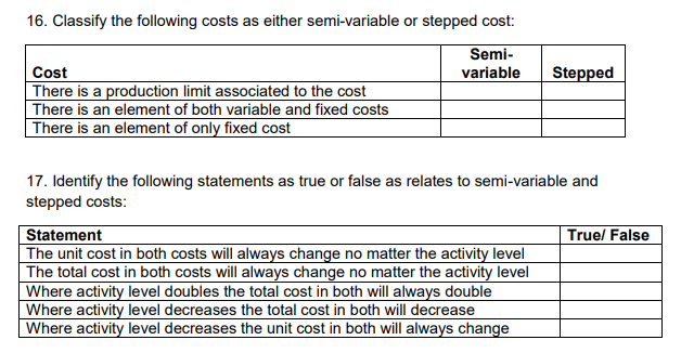 Semi-variable costs- these are costs that have a fixed element and a variable element. This means that if production were to double, the cost of production will not double because of the fixed cost element in the production cost, which will remain the same. For example, the cost of electricity for the factory has a fixed element relating to lighting and a variable element relating to power used in the production line.