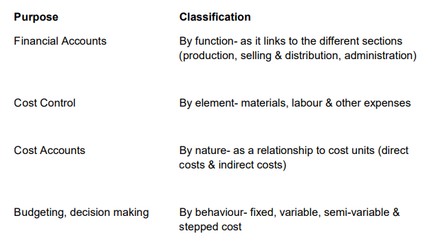 Every organisation in operation will usually incur costs of different kinds. Costs can be logically grouped in different ways. The particular grouping selected will depend on the purpose for which the resulting analysed data is intended to be used. Different forms of accounts will require accounting records and costs to be classified in different ways in order to be able to achieve the required results.